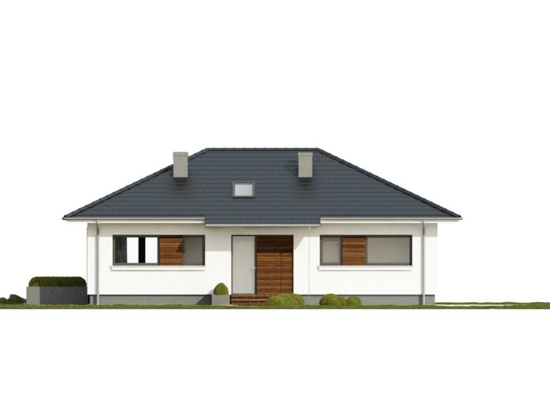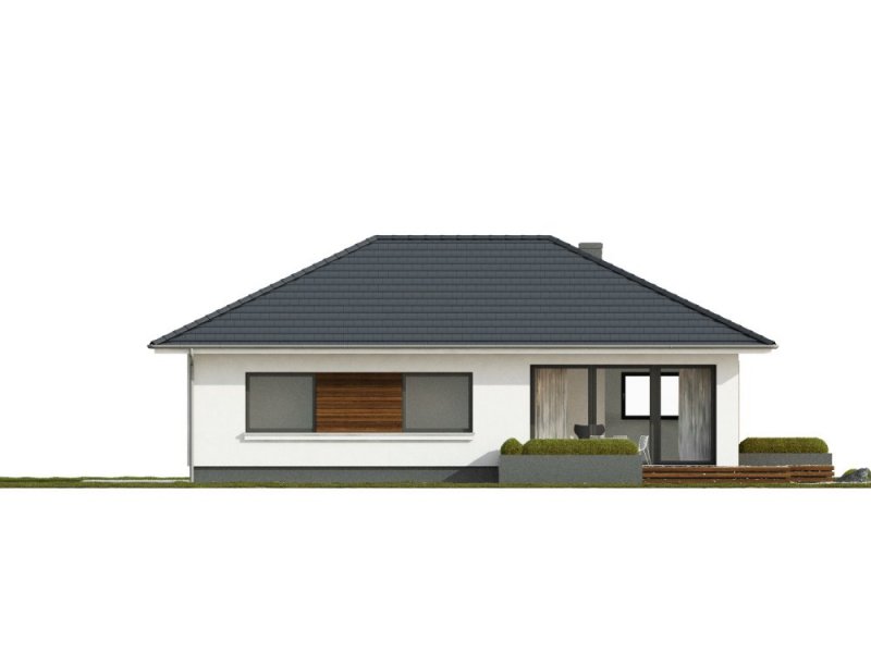 Ten nieduży, ekonomiczny i energooszczędny dom adresowany jest przede wszystkim do osób pragnących skorzystać z rządowego programu „MIESZKANIE DLA MŁODYCH”. Zaproponowano prostą, zwartą i tradycyjną bryłę w nowoczesnym wykończeniu i kolorystyce. Na parterze zaplanowano obszerny salon w sąsiedztwie którego zlokalizowano kuchnię oraz pomieszczenie wielofunkcyjne, mogące pełnić rolę garderoby i pralni. Przeszklona ściana pokoju dziennego sprawi, że częściowo zadaszony taras ogrodowy stanowić będzie przedłużenie salonu. W części nocnej domu zaprojektowano trzy bardzo duże i funkcjonale sypialnie oraz dwie łazienki.