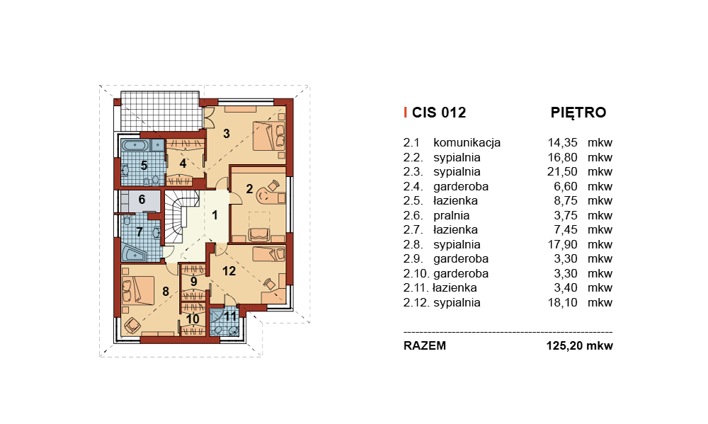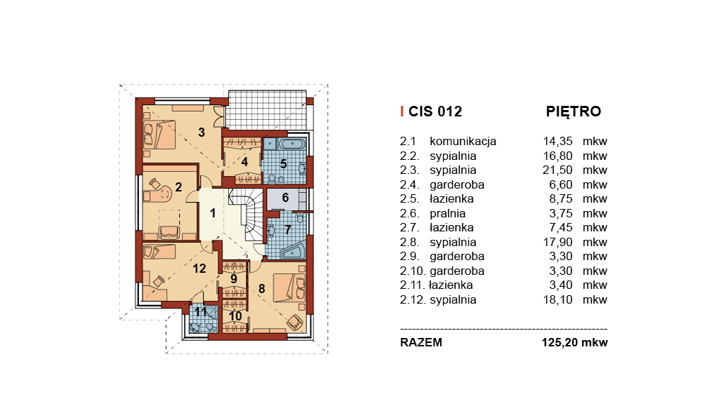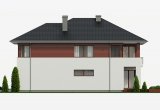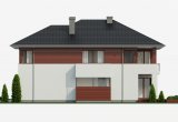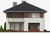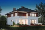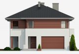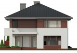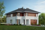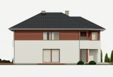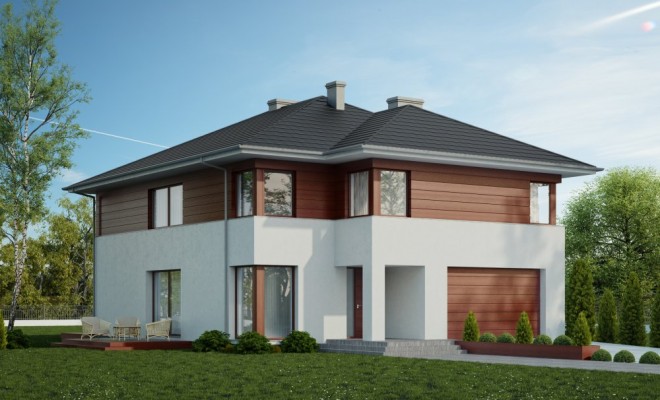 Dom jednorodzinny, piętrowy o nowoczesnej, prostej architekturze, zaprojektowany z myślą o 5-6 osobowej rodzinie, posiadający garaż dwustanowiskowy wpisany w bryłę budynku. Ogromnym atutem projektu jest duża powierzchnia użytkowa zamknięta w prostej, zwartej bryle przykrytej kopertowym dachem. Dzięki małym gabarytom, budynek można wznieść nawet na niedużej, wąskiej działce, nie tracąc nic z jego walorów użytkowych. Na parterze przewidziano obszerny salon z wydzieloną jadalnią w sąsiedztwie której zlokalizowano kuchnię. Z salonu zaproponowano wyjścia na dwa tarasy w tym jeden zadaszony. Na piętrze zaplanowano cztery wygodne sypialnie, każda z własną garderobą oraz łazienką. Dodatkowo z sypialni gospodarzy domu zaprojektowano wyjście na zadaszoną loggię z widokiem na ogród.