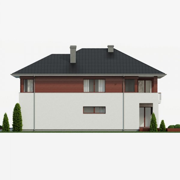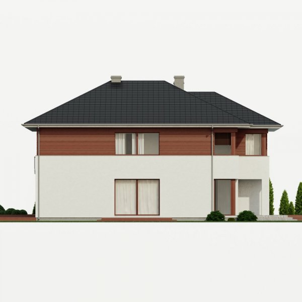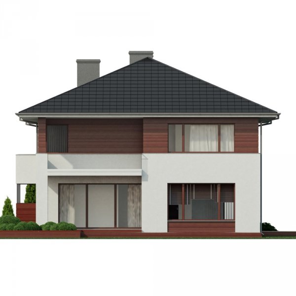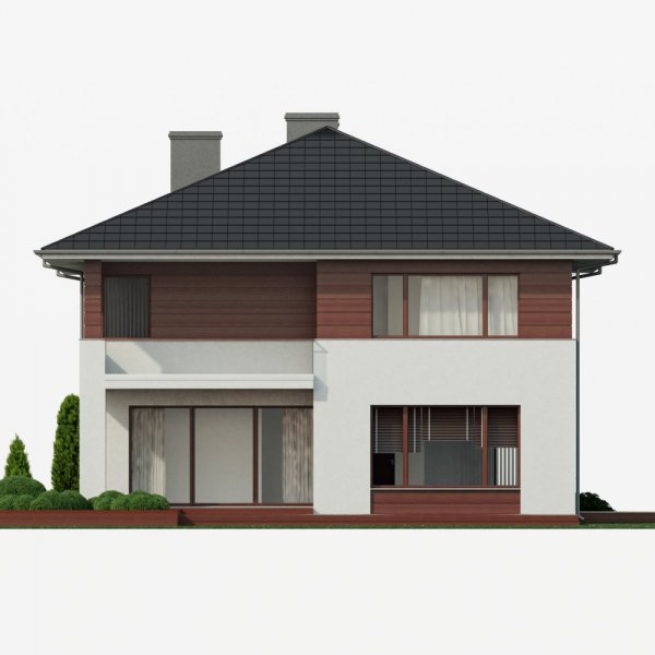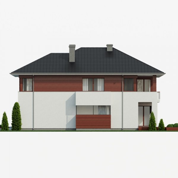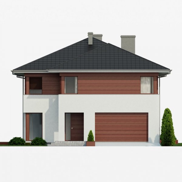 Dom jednorodzinny, piętrowy o nowoczesnej, prostej architekturze, zaprojektowany z myślą o 5-6 osobowej rodzinie, posiadający garaż dwustanowiskowy wpisany w bryłę budynku. Ogromnym atutem projektu jest duża powierzchnia użytkowa zamknięta w prostej, zwartej bryle przykrytej kopertowym dachem. Dzięki małym gabarytom, budynek można wznieść nawet na niedużej, wąskiej działce, nie tracąc nic z jego walorów użytkowych. Na parterze przewidziano obszerny salon z wydzieloną jadalnią w sąsiedztwie której zlokalizowano kuchnię. Z salonu zaproponowano wyjścia na dwa tarasy w tym jeden zadaszony. Na piętrze zaplanowano cztery wygodne sypialnie, każda z własną garderobą oraz łazienką. Dodatkowo z sypialni gospodarzy domu zaprojektowano wyjście na zadaszoną loggię z widokiem na ogród.