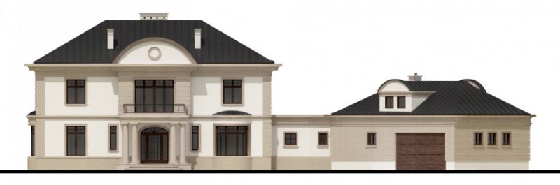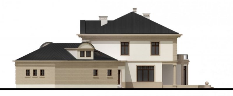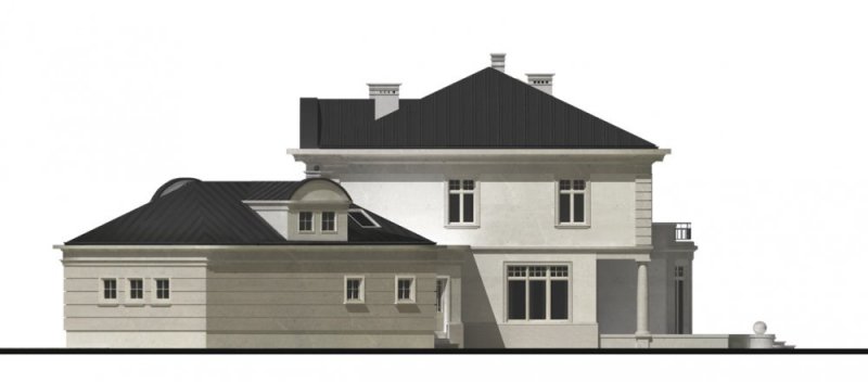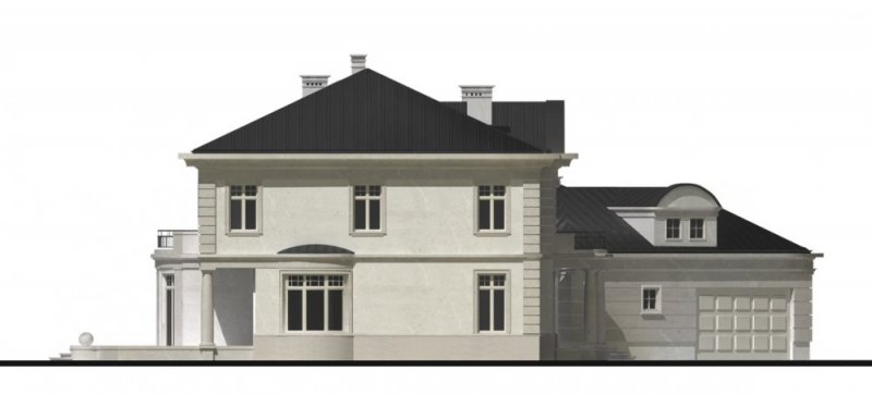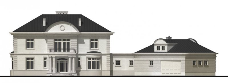 Wolno stojący dom jednorodzinny o charakterze rezydencjonalnym dla miłośników klasycznej architektury, koneserów harmonii i dobrego smaku. Idealny dom dla osób wymagających, ceniących wygodę z funkcjonalnie zaprojektowanymi i przestronnymi wnętrzami. Na parterze centralną pozycję zajmuje reprezentacyjny hall z otwartą klatką schodową. Oprócz pokoju dziennego, na parterze przewidziano obszerną kuchnię, jadalnię, pokój telewizyjny oraz gabinet. Na piętrze zaplanowano cztery sypialnie, wszystkie z łazienkami i garderobami.
