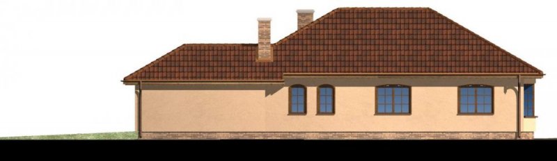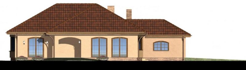 Ten wygodny, parterowy dom w tradycyjnym stylu adresowany jest do 4-5 osobowej rodziny. Na parterze zaplanowano obszerny salon z wyjściem na efektowny, zadaszony taras, w sąsiedztwie którego zlokalizowano wydzieloną jadalnię oraz kuchnię. W drugim skrzydle budynku zaprojektowano trzy sypialnie z pokojem kąpielowym i dodatkową łazienką.